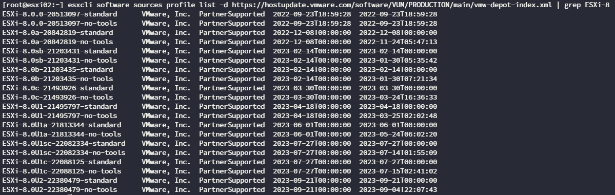esxcli software sources profile list -d https://hostupdate.vmware.com/software/VUM/PRODUCTION/main/vmw-depot-index.xml | grep ESXi-X.Y.Z