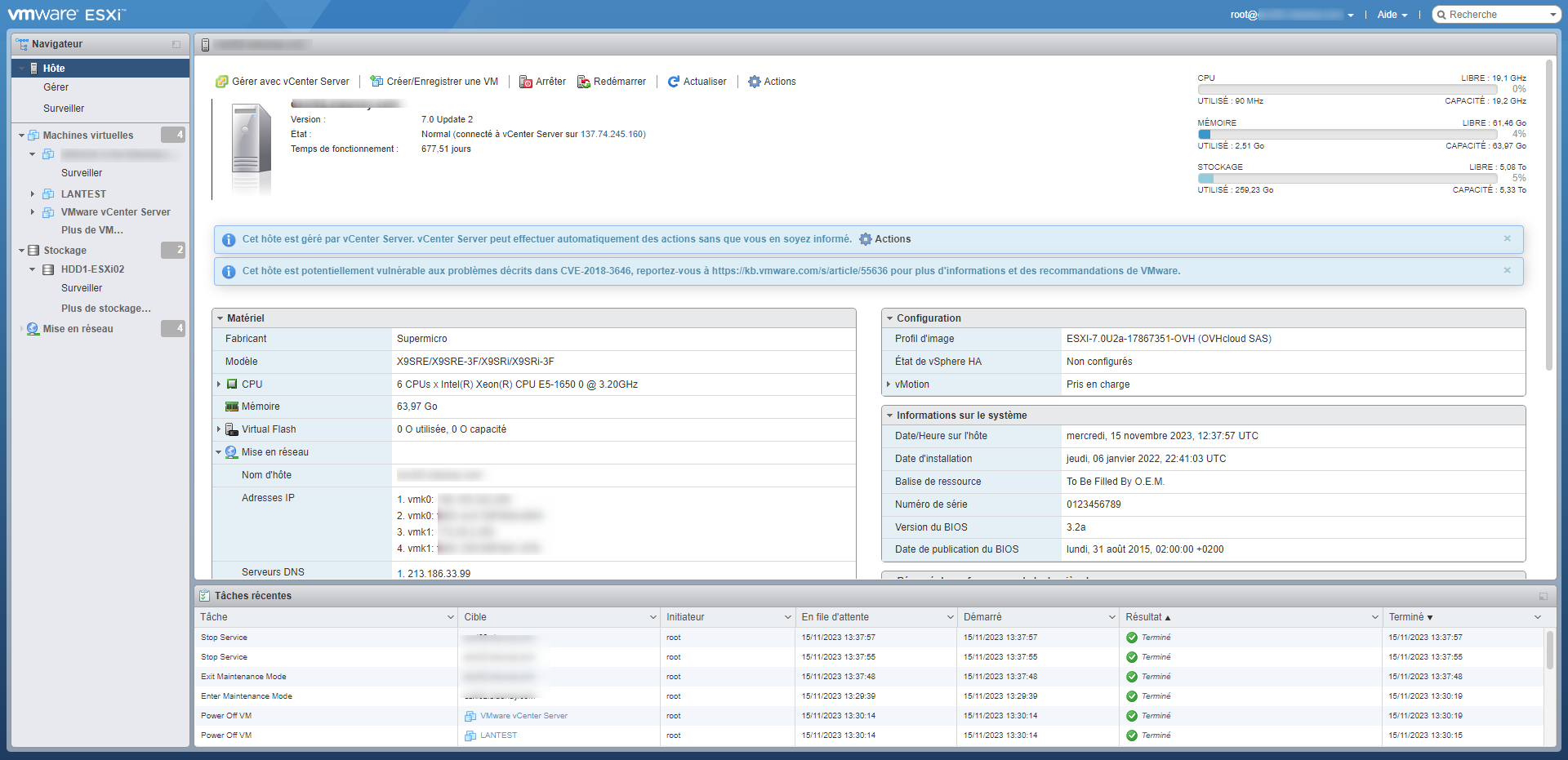 Une fois redémarré connectez-vous sur l’ESXi Host Client avec un user "root" et-vous constaterez la nouvelle mise à jour installée